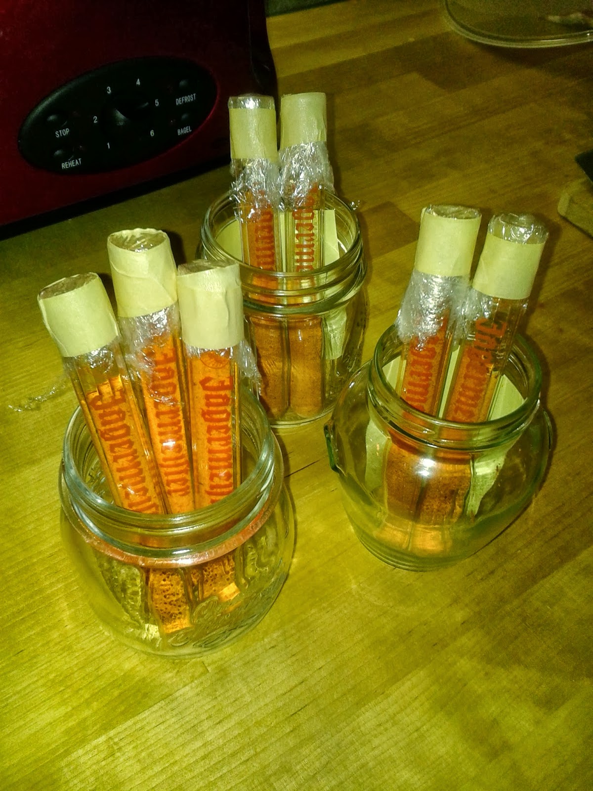 Peperoncini Calabrese - tai mikälie Italian tuliainen onkaan. Viimeisin sadonkorjuu ja kuivatuksen jälkeen jauhettu nämä sekä aikaisemin kuivatut. Tätä lajia riittää nyt taas pariksi vuodeksi eikä tarvitse haikailla Italiaan ainakaan tämän mausteen takia.