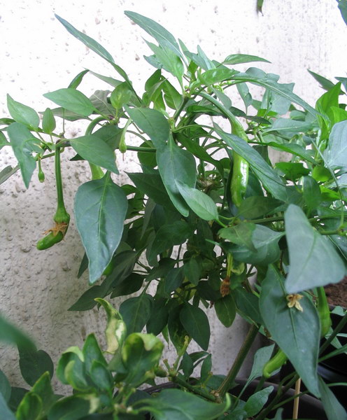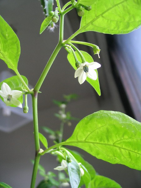 Samalla ikkunalaudalla mullassa kasvava habanero ensin kukki oikein hienosti, sai juuri kypsäksi yhden podin, aloitteli toista, mutta ei jaksanut tehdä siitä täysikokoista. Viime kukinta ja podin tekeminen otti niin koville, että suuri osa lehdistä tipahti, mutta nyt on taas uusi kukkiminen alkanut. Saa nähdä, pysyykö se hengissä tästä uudesta rasituksesta. Taidan ruveta lannoittamaan sitä vähän enemmän, niin ehkä tuo kukkiminen ei sitä tappaisi.