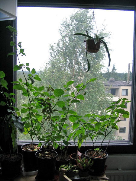Viime kausiTakana on yksi kausi kasvien kasvattelua, aikaisemmin kaikki kasvit ovat hyvin nopeasti kuolleet veden puutteeseen, jopa lajit, joita "ei saa tapettua", kuolivat jopa altakasteluruukuissa. Viime keväänä kuitenkin kävi niin, että Citymarketista sai halvalla mangoja, joiden valtavaa siementä piti sitten koittaa idättää. Ekat kaksi kuoli, mutta toiset kaksi ovat edelleen hengissä. Sen jälkeen pistin itämään melkein kaikkia kaupasta löytyviä siemeniä, mukaan lukien chilejä. Nyt ikkunalaudat alkavat näyttää täysiltä, mutta lisää kasveja on tulossa. Jos joku haluaa hakea osan niistä pois, niin ottakaa yhteyttä, köyhät saa ilmaiseksi, muut voi lahjoittaa jotain hyödyllistä (esim. rahaa, lamppuja, tuulettimia, chilejä) tilalle omantunnon mukaan...