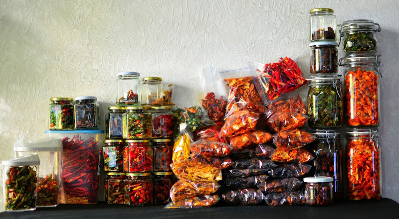 Kausi alkaa olemaan melkoisen paketissa, parvekkeen kasvit tyhjätty podeista ja niitä tuli baccatumeista viimeisellä kerralla 900g. Sisälle podejaan kypsyttelemään päässyt Starfish x Hot Tree Pepper F2 tuli siivottua podeista ja loppusatoa yksistään siitä 1.2kg, kauden kokonaissaldo ko. lajikkeesta liikkuu jossain 2-3kg välillä ja satoa tuotti parvekkeella parhaiten. Chinenseistä parvekkeella tuli yhteissaldona podeja hurjat 40g, kahdeksasta kasvista - liian vähän valoa.