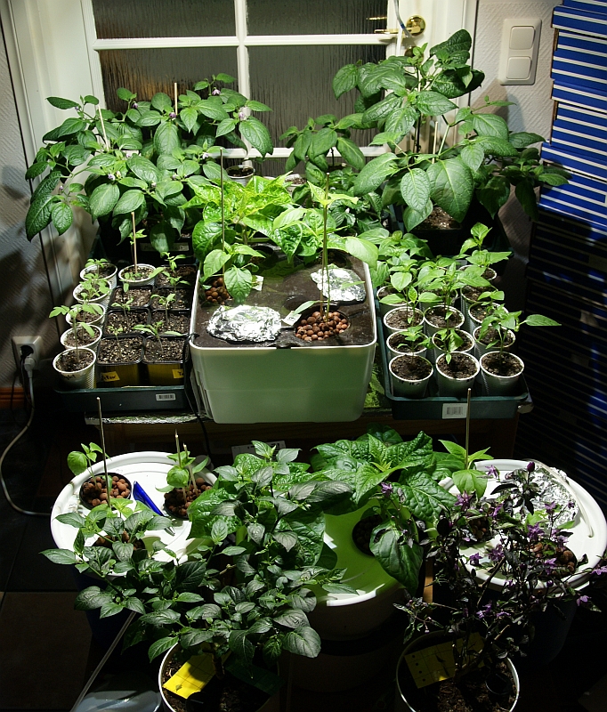 Sekalaisia rääpäleitä. Serranot (yksi vasemmalla alhaalla) ei näytä onnistuvan mulla taaskaan. Lehdet käpristyy ja kasvu on hidasta. Pitää ottaa ne kokeeksi vesikuurille.