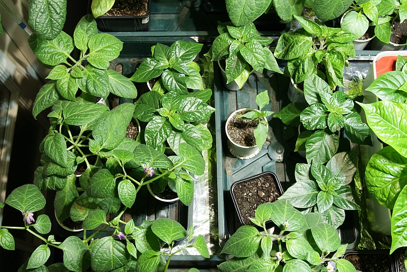 Chinenset kasvaa täälläkin matalasti jaa tuuheasti (oikealta Bonda Ma Jaqcues, PI 315027#1 ja Biquinho). Valoa ei ainakaan ole liian vähän.