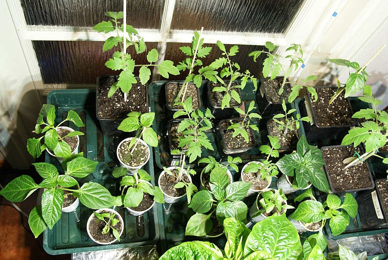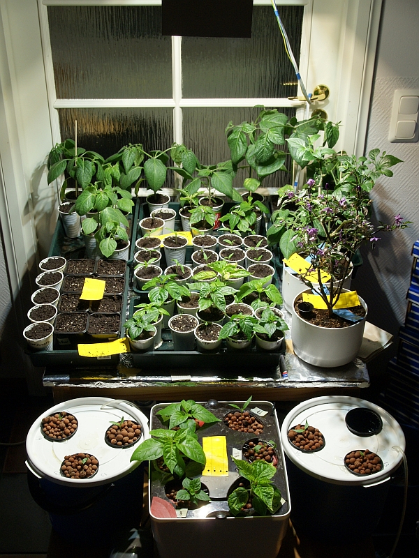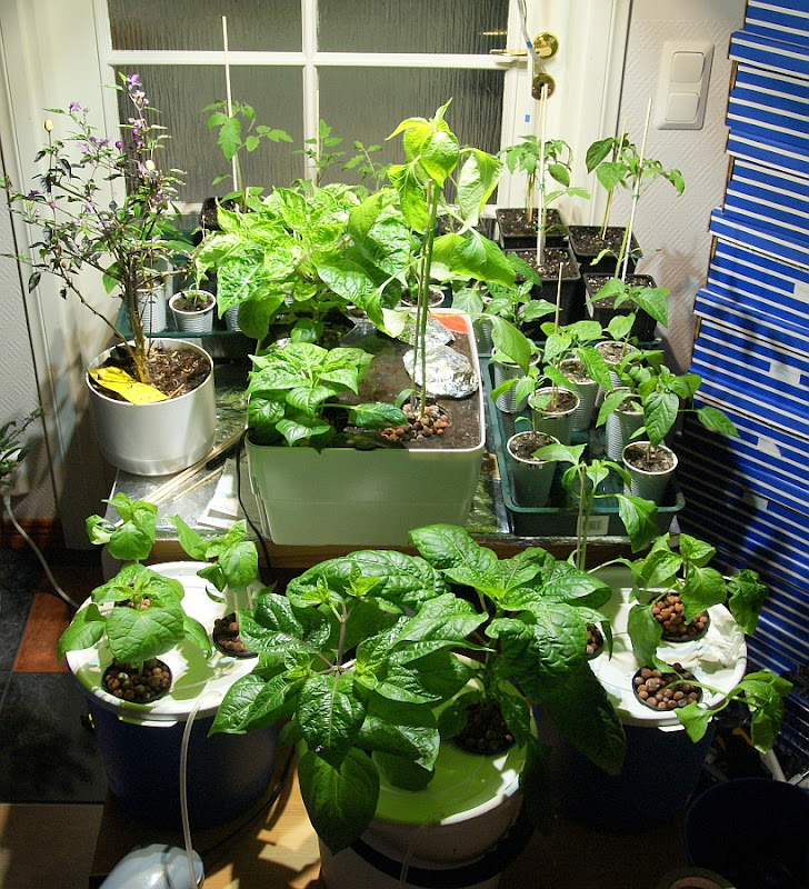Nyt alkaa tulla ahdasta vaikka suuri osa taimista on edelleen pieniä. Chinesejä on edelleen 2 dl mukeissa, mikä vaikuttaa hidastavan jo kasvuakin. Valon teho ei riitä paljoa isommalle alalle, joten autotalli ja natikka kutsuu. Lisää kuvia kunhan saan jotain aikaan.