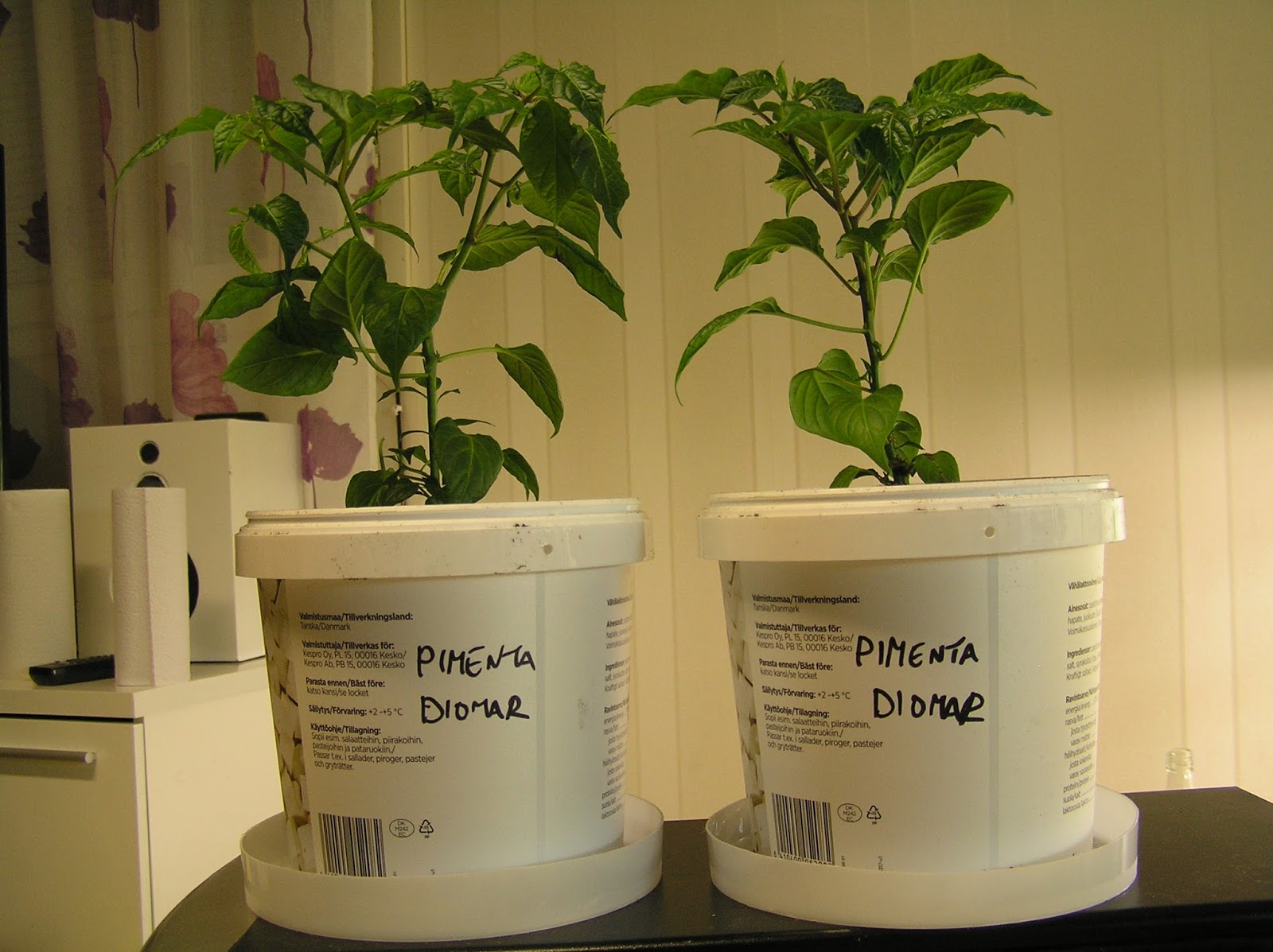 Pakkohan sitä oli pari siemenä panna itämään kokeeksi, kattoo miten käy. Ruukutushommat jatkuu taas tänään. Pimenta Diomareilla ainaski on jo kiirus...