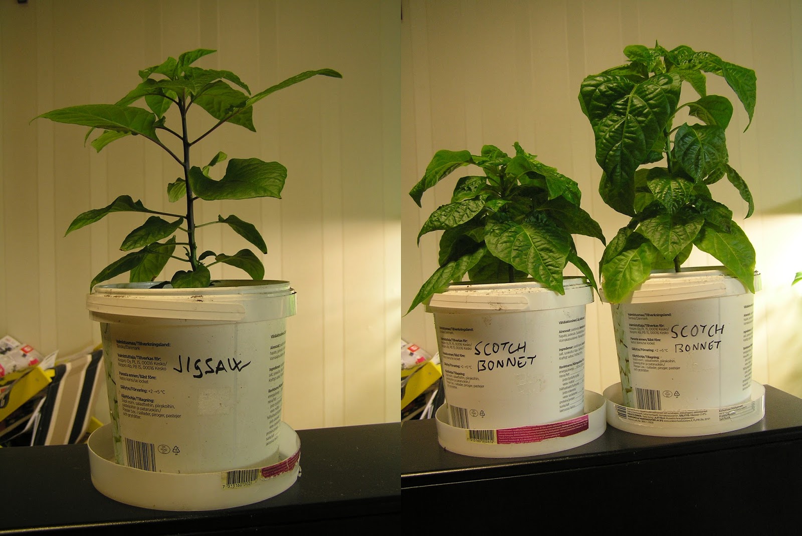 Yksi Scotch Bonnetin taimi tuli myös yritettyä hukuttaa. Olin näköjään antanut sille vettä samaan tahtiin kuin viereisille Goronongeille, mutta juomatahti ei ollutkaan yhtä kiivas. Maitopurkin pohjaan reiät ja toinen purkinpohja siihen alle. Jospa se multa siitä pikkuhiljaa kuivaisi.