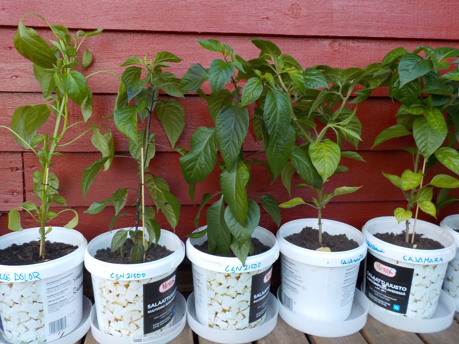 Tähän kuvaan onkin sitten saatu ympättyä kokonaista viisi kasvia. Melkonen urakka oli tunkea nuo kaksi Poblanoa samaan astiaan, toivottavasti selvisivät hengissä tuosta koettelemuksesta.
