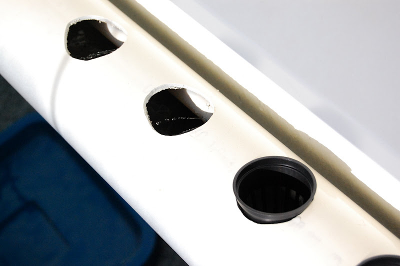 Ensimmäiseksi laskin mittanauhan avulla montako ruukkua saisin mahtumaan metrin matkalle. Juurille tulee kuitenkin jättää hyvin tilaa, joten kovin montaa kasvia en tähän saisi kasvamaan. Viisi olisi ehkä mennyt, mutta päädyin kuitenkin neljään. Seuraavaksi porasin 50mm reikäsahalla neljä reikää n. 20cm välein toisistaan. 50mm ruukut sopivat näihin täydellisesti. 80mm tulppaan porasin aivan sisäseinää myöten 20mm reiän letkuliittimelle.