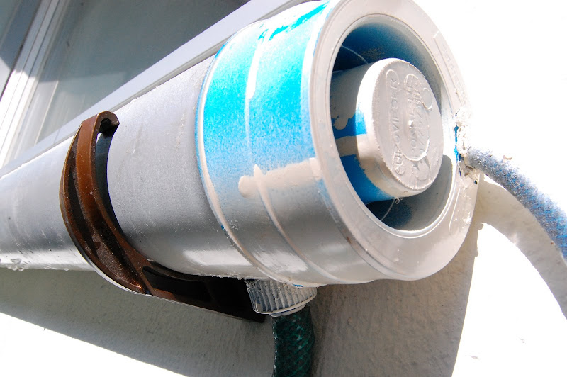 Silikonin kuivuttua työnnä tulppa tiukasti 80mm 1m putken liitokseen, niin että letkuliitin on alareunassa.