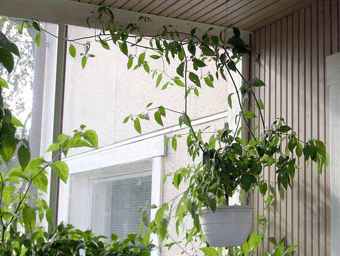Parvekkeen nurkkaa siivotessani huomasin, että tämän kesän turhin kasvatettavani, Rocoto Manzano Orange kantoi ja levitti lehdillään ripsiäisiä, vaikka ei itse niistä näytä kärsivän. Pubeen ne tekevät vain minimaalisia vioituksia, mutta vieressä ja lomittain kasvava Aji Amarillo oli syöty pahemmin. Tuossa Rocotossa ei siis ole edes kukkanuppuja, vaikka sillä on mittaa jo 4 metriä; 2,60 huoneen korkeus ja 1,40 katossa vaakasuoraan. Mutkittelut matkalla korvannevat ruukun korkeuden.  ::)  Ulkona siinä on nyt muutama herneen kokoinen raakile. Amarillo on 20 cm lyhyempi, mutta siinä sentään on reilusti satoa, vaikka kypsyvätkin hitaasti. Tämä kasvattelee tasaisesti 10-12 senttisiä. Yli 20 senttisiä palkoja kasvattava Amarillo täytyy olla eri lajike, vaikkakin saman niminen.