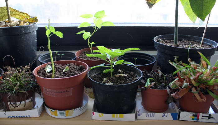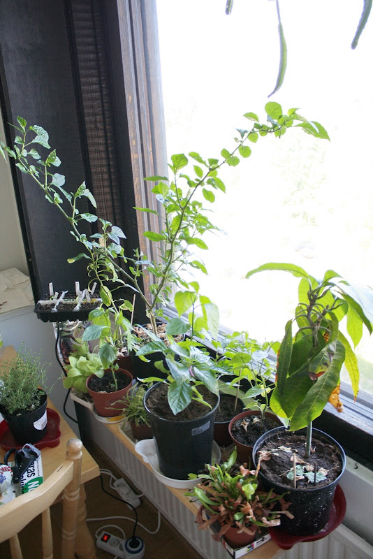 Keittiö on tällä hetkellä lastentarhana. Kuvassa takarivissä vasemmalta oikealle: Isossa ruukussa näkyy pieni pätkä Harold st. Bart's:in vartta, pari pientä PI 260567:ää, Lemon Drop, kaksi Red Datilia (joista toinen vasta lenkkeilee pinnalle, eikä siis näy kuvassa), sekä mangopuun varsi. Etualalla on huonosti voiva Tahma-lihis, makea suippopaprika, chili, josta unohtui lappu ruukunvaihdon yhteydessä, Leuka-lihis ja Kannu-lihis. Nämä kaikki lihikset voivat nyt tosi huonosti, joskus ne näyttivät tältä. Mysteeri-chili tuossa keskellä on lehdistä ja kasvutavasta päätellen chinense, eli silloin mahdollisuudet rajautuvat Pink Habaan, Red Datiliin ja Aji Dulce Amarilloon. Saa nähdä mitä siitä tulee.