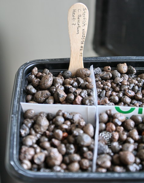 Ihan kokeilumielessä kylvin pari uutta siementä jo valmiiksi asutettuihin ebbeihin. Aikaisemmat kasvit ovat olleet hydroissa pian vuoden, ja kaivoin lecasoran joukkoon pari siementä. Siemenet piti laittaa noin kolmen sentin syvyyteen, missä lecasora pysyy jatkuvasti kosteana. Kokeilen, että pystyykö lecasorassa idättämään suoraan, pystyykö taimi tunkemaan kolmen sentin lecasorakerroksen läpi kohti (keino)aurinkoa, sekä pystyykö uusi taimi kasvattamaan kunnolla juuria, kun juuritila on jo vallattu. Juuria ei ainakaan ylimmän kolmen sentin matkalla ole mitenkään aivan hirveästi, syvemmältä en ole tutkinut. Ravinteita uusien juurien pitäisi kuitenkin saada samalla tavalla, kuin vanhojenkin.