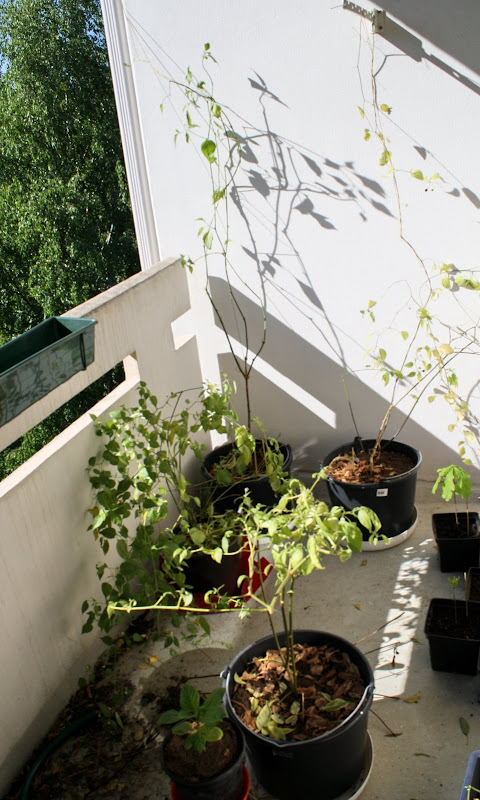 Olohuoneesta parvekkeelle siirretyt kasvit alkavat pikkuhiljaa toipua. Kasvit olivat jo ennen siirtoa huonossa kunnossa, kun olivat hämärässä olleet, ja siirto suoraan parvekkeelle oli aikamoinen shokki. Starfish on pudottanut noin 90% lehdistään, CGN19198 melkein yhtä paljon. Lisäksi leikkelin ja nypin kellertäviä lehtiä pois niistä ihan suosiolla, ei niistä enää kuitenkaan mitään kunnollista tule, varjostavat vaan uusia lehtiä. Keltainen Rocoto pieneni myös melkoisesti parvekkeelle siirryttyään, mutta siinä on vähän enemmän lehtiä. Viime kesän jälkeen sijoitin C02598:n kouluun pois nurkista, ja nyt se on taas löytänyt kotiin parvekkeelle. Se on sen verran matala, että mahtuu aika hyvin kaiteen taakse piiloon. Olkoon siellä pari viikkoa. Siitäkin poistin huonomman näköisiä oksia ja lehtiä. Se kukkii!