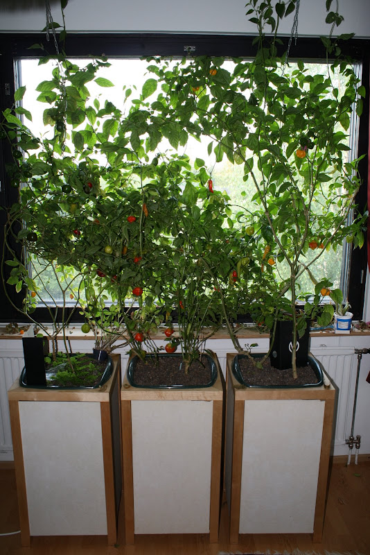 Kuvassa takana vasemmalla Starfish ja oikealla CGN19198 (joka teki pimeässä olohuoneessa 3 podia). C02598 on niiden kahden edessä punaisella alustalla. Keltainen rocoto ja tuntematon chinense ovat etualalla. Aivan kuvan oikeassa reunassa on kaksi tammea, jotka ovat osa tuolinkasvatusprojektia. Kaksi muuta tammea ei selvinnyt viime talvesta.