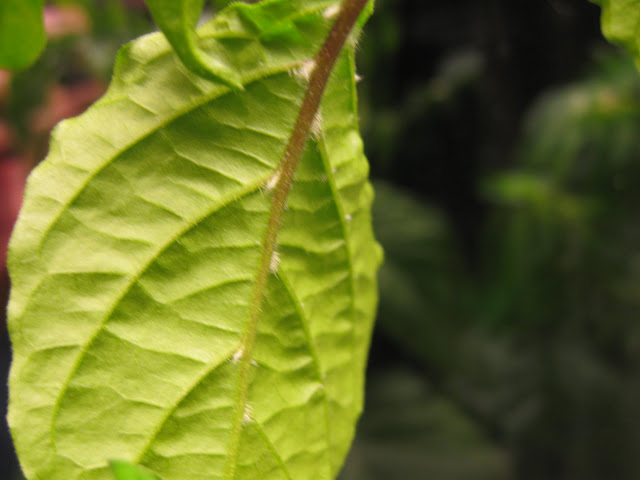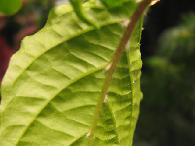 Otinpa järeät aseet käyttöön! Katselin nimittäin paria lehteä lasten mikroskoopilla. 75- kertainen suurennos (välillä 300x) ei paljastanut mitään elukkaa. Haituvat näkyivät läpinäkyvinä karvoina.
