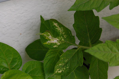 Tomaattien lehdissä alkoi näkyä outoja pilkkuja, jotka tulkitsin ravinnepuutokseksi. Koitin katsella tuhohyönteisiä, mutta en niitä tavannut. Jokaisessa kasvissa näkyi merkkejä, vaikka lannoitepitoisuudet piti olla 1,2 ja 3, mikä vähän hämmästyttää.