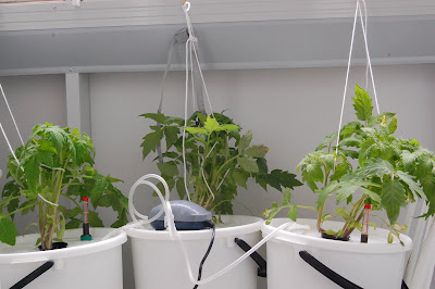 3x10l ämpäri, joihin pumppaa ilmaa Resun AC-9901. Sen yksi ulostulo on haaroitettu neljään. Bonuksena jokaisessa ämpärissä vesimittari. Ämpäreissä tomaatit ja parvekkeen seinältä lähtien liuokset suunnilleen (N-P-K-Mg-S-Ca):