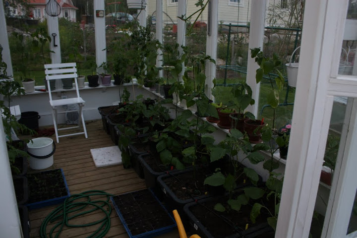 Tuossa yleiskuvaa chilipuolesta. Loppupäässä on kurkkua ja tuossa irtopurkissa kurpitsan taimi, josta kasvattelen sellaisen mopoauton kokoisen.