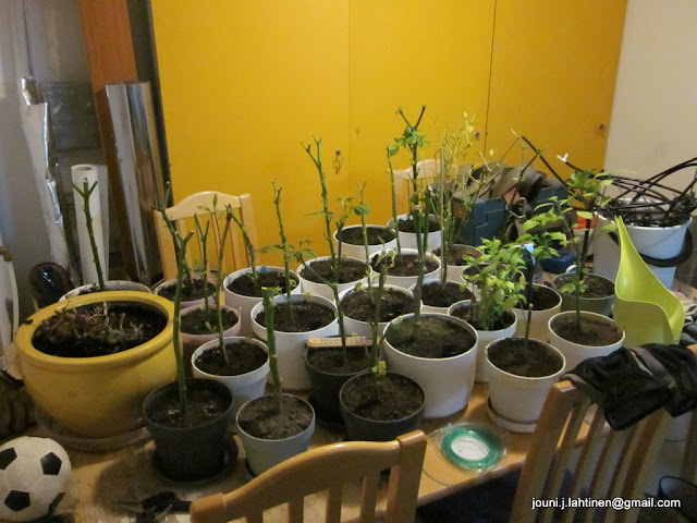 Ojalan laskuopin mukaan tuosta saadaan ainakin 33 lajiketta yhteensä. Kutakin on laitettu kasvamaan vähintään kaksi kappaletta, joitakin kolme tai jopa neljä. Taimia on siis tulossa :)
