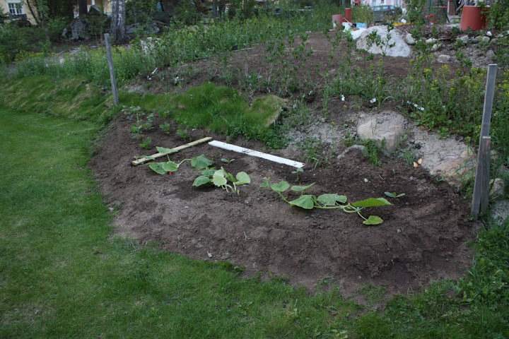 Paiskasin kurpitsat jo pihalle kasvamaan. Ovat aika ahtaasti mutta kyllä sopu sijaa antaa.