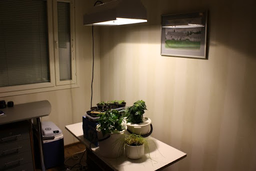 Uusi kausi oli pakko aloittaa kun sain monimetalli/spna valaisimen. Raahasin autotallista vanhan tv-tason jonka päälle ruuvasin ylimääräisen työtason pätkän. Ja ei muutakuin siementä kasvamaan. Toisessa ämpärihydrossa on jonkin sortin Habanero kasvamassa, joka kitui koko kesän ulkona kylmissään ja oli erittäin huonokasvuinen. Laitoin sen ämpäriin vesipumpun kanssa ja Bio Novan BN NFT aqua liemen kanssa, jonka hankin Pispalanpalmu/Hempsteri vesipiippukaupasta. Leikkasin sitä jo reilusti kun se oli loistareiden alla ja katsotaan miten se nyt pärjää.