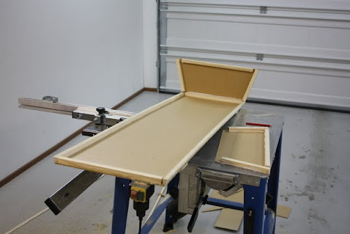 Sahasin pitkälle sivulle tulevat tukirimat uudelleen noin 20 asteen kulmaan. En oikeastaan tiedä miksi mutta ajattelin, että tästä tulee sellainen arkun kannen mallinen valaisin, joita on biljardipöytien yllä.