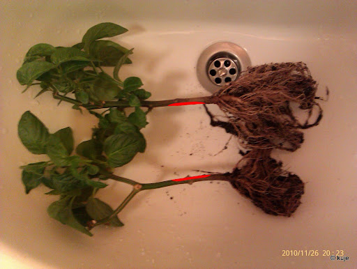 Juu eli tuohan ei ole "oikea" varttaminen, jos on omat juuret kasveilla. Olisi voinut olla myös ylempää kiinni nuo nippusiteet, niin olisi vielä mukavempi! 8) Muuten kyllä todella onnistunut ja varmasti loistava kasvi. Podeista on vaan turha ottaa siemeniä, kun puhtaus on luokkaa ei tiedossa.