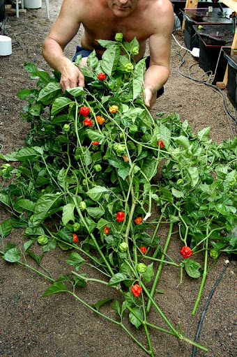 Seuraavaksi lähtee Caribbean red habanero. On niin pahasti kasvanut ja podit vaikeasti kerättävissä niin poikki koko puska ja ulkona sitten keräillään.