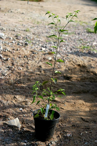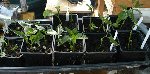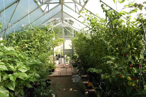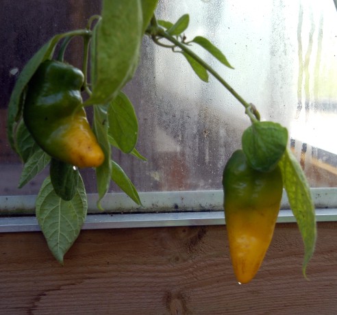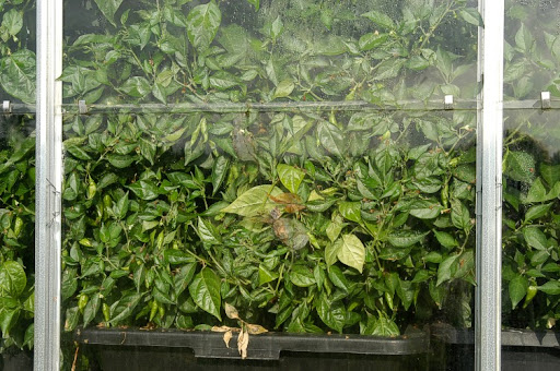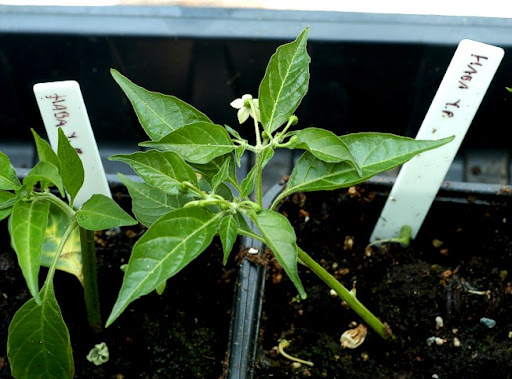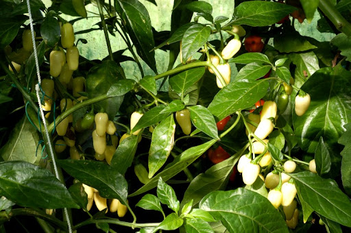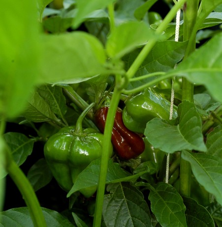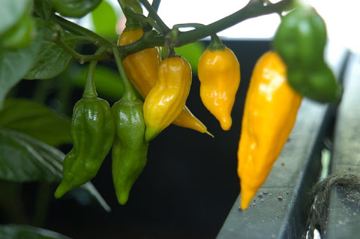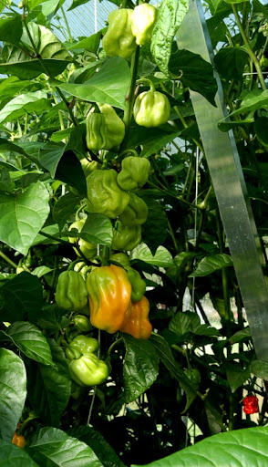 Aji habanero kasvarin ulkopuolelta kuvattuna, muutoin ei näy koko kasvia.
