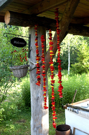 Kyllähän se aikaa vie, kasassa oli yli 400 podia. Ristras on helppo tapa kuivata; kirurgisella tai muutoin erittäin terävällä veitsellä chilin kylkeen pitkittäisviilto jotta kuivuu nopeammin, pujotus parsinneulan avulla karhunlankaan ja rimpsuksi katoksen alle roikkumaan. Luonto hoitaa kuivatuksen.