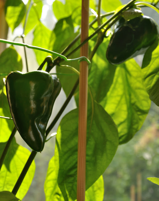 Siinä pari Poblanoa. On niissä kivasti massaa. Toimiiko täytettynä? Ovat varmaan minä päivänä tahansa vaihtamasssa väriä.