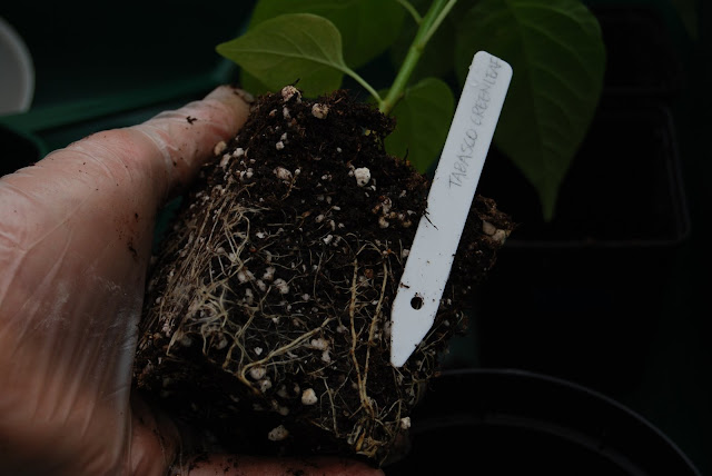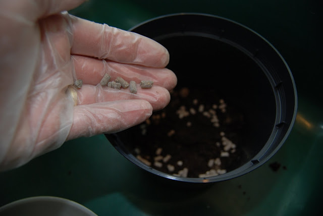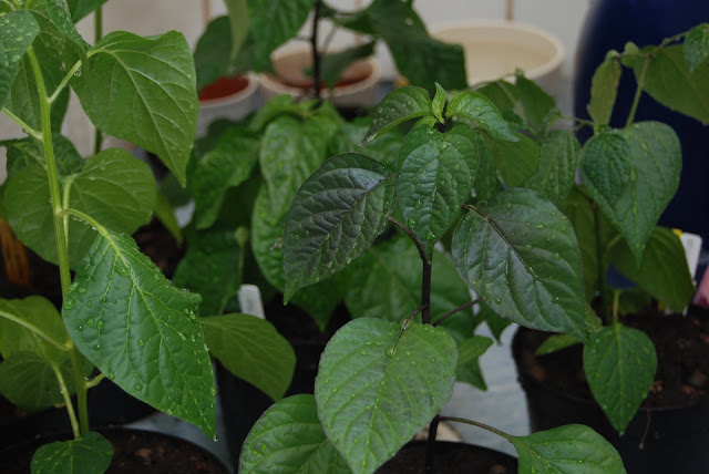 Inspired by Mats I planted the second time early this year (check out Mats great blog). The varieties were in turn Bhuta Jolokia, Inca Red Drop, Locato PI387838, Pimenta Barra Do Ribeiro, Tabasco Greenleaf, Pimenta Da Neyde and 7 Pod. The plants were rooted through the fine, so it was a good time to give them bigger pots. I added a little chicken manure, which gives an extra kick with nitrogen.  As you can see I filled in with considerably with soil because the soil tends to sick together when watering. The ancient pots hold approximately 0.6 l - the new 1.5 l (2.5 l for the Bhut Jolokia).