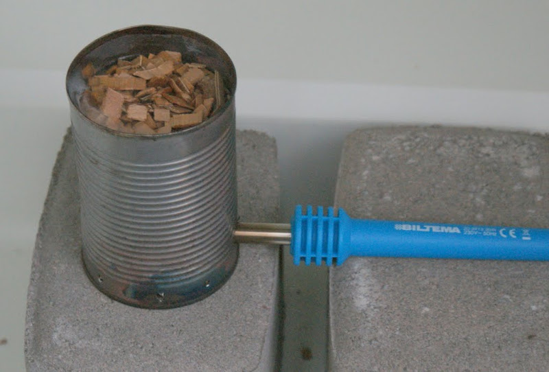 Savustin on viimein pyörimässä. Kuvissa ensimmäinen testiajo. Savunkehitin on Bilteman kuuden euron kolvi säilykepurkissa ja systeemi vaikuttaa toimivan. Purut alkaa ilmeisesti kyteä ja palaa itsekseenkin, kun eilisen testin jäljiltä purkissa oli aamulla lähinnä tuhkaa vaikka kolvi ei ollut päällä kuin tunnin pari. Parhaillaan on savustumassa satsi Lemon droppia ja Aji cirstalia.