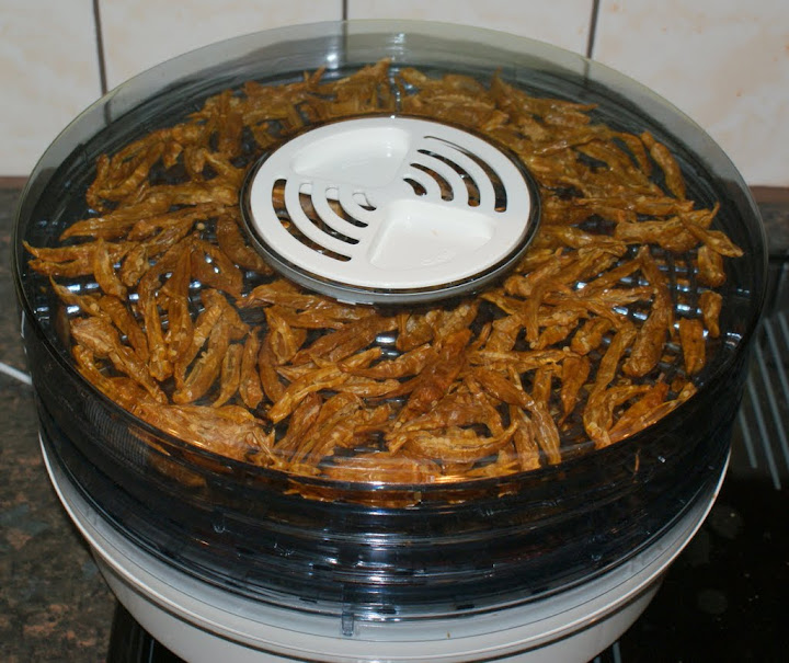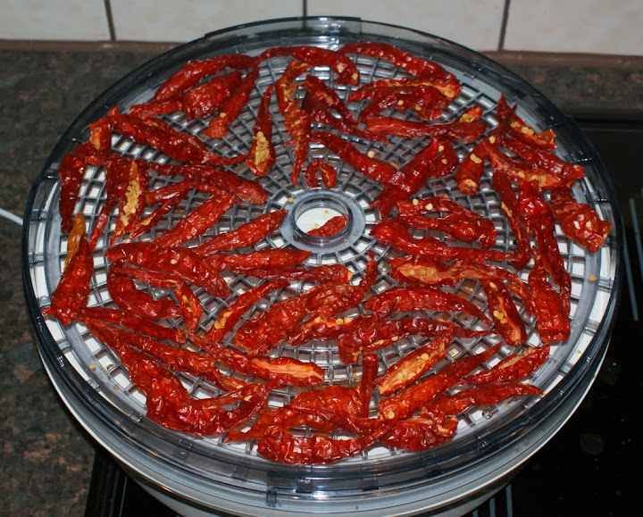 Eka satsi on savustettu ja kohta kuivattukin. Tässä kuivurissa savustettua Aji cristalia ja Lemon droppia. Näitä en ole vielä maistanut, mutta savustamaton kuivattu Lemon drop tuntui yllättävän miedolta. Käykö yleensäkin niin, että kuivaus miedontaa chiliä?
