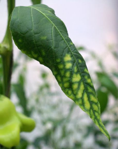 Kyseessä voisi olla magnesiumin puute. Omalla Championille annoin teelusikallisen kalkkia ja minullakin näyttäisi siltä että leviäminen pysähtyi. Lehdet eivät kyllä enään korjaantuneet.