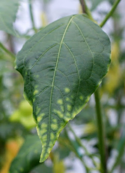 Taas ihmettelyä. Mikä voisi olla syynä, kun lehtiä muuttuu laikukkaiksi? Joku puutosoire? Tuollaisia lehtiä on tullut yhtäkkiä muutama kymmenen mullassa kasvavaan Bishops crowniin, mutta samantyypistä vikaa näytti olevan vähemmässä määrin myös muissa baccatumeissa. Joissain lehdissä keltaista on enemmänkin. Lannoituksena on Blumat-kastelun kautta edelleen Hydroflex T ja salpietari, lisänä Topmaxia.