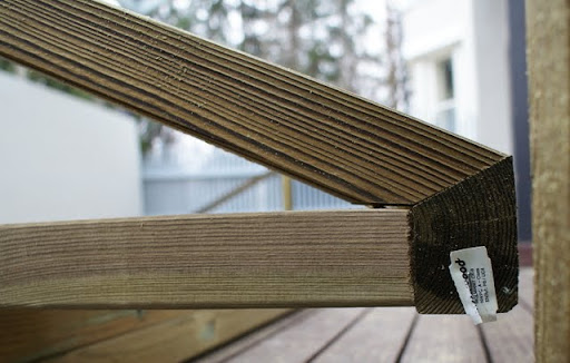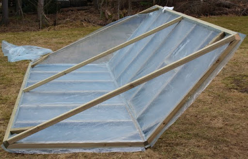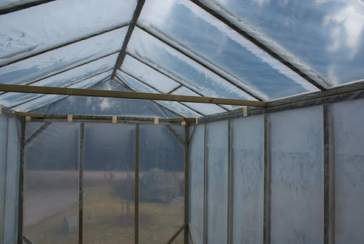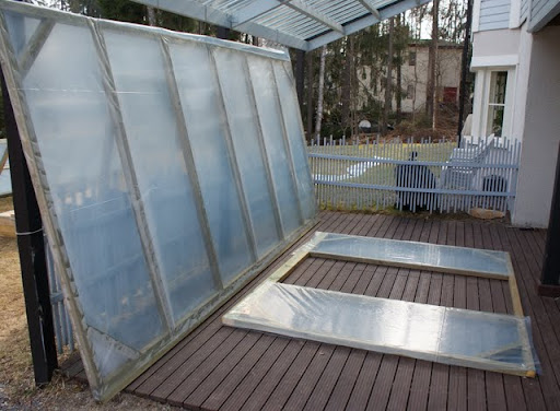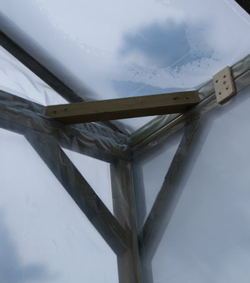 Yksityiskohta ylänurkasta. Puu on niin märkäää, etä vesi tirskui välillä ruuvatessa ja muovit on sisäpuolelta ihan huurussa.