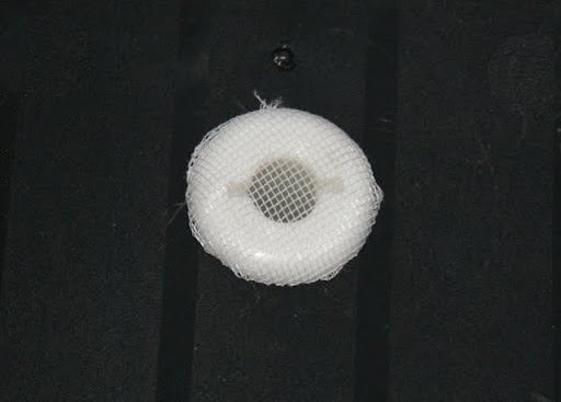 Eli muotoilee ristinmuotoisen n.5x5cm verkonpalan jonka tunkee taitellen läpivientiin.