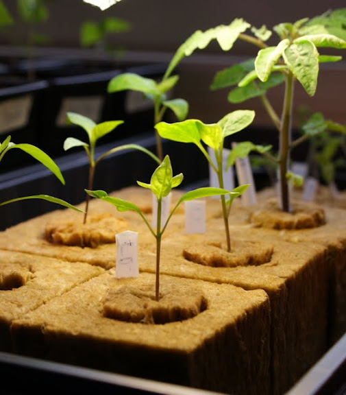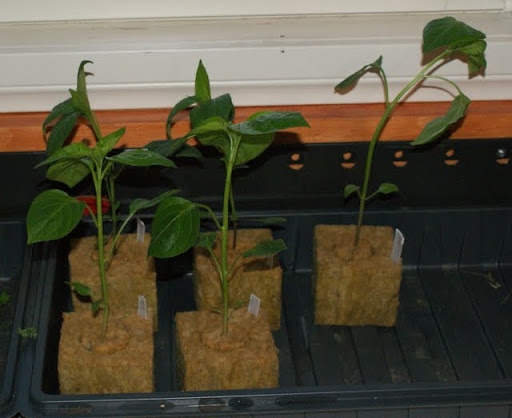 Sitten on vielä viisi taimea samoja lajikkeita kivivillassa odottamassa ebbeihin pääsyä. Ebbit pitäisi vaan ehtiä rakentamaan samoin kuin telineet kasvariin. Lisäksi aioin kokeilla ebbissä tomaattia, joita löytyy kolmea sorttia. Niitä tule myös multaan.