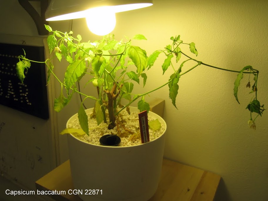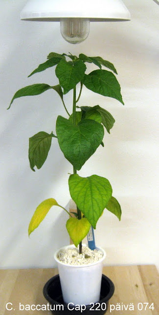 C. baccatum CGN 22871 on nyt riutunu ja räytyny parisen kuukautta ton 20W muovikuorella päällystetyn eslin alla. Muutenkin tolla on ihan erilainen kasvutapa kuin muilla näkemilläni kasveilla, amppeliin suositeltu. Siirränpä hänet ikkunalle ikioman 85W eslin alle. Katsotaan tuleeko kiitosta.
