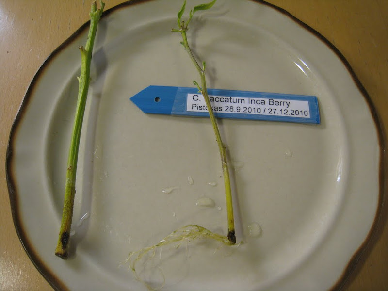 C. baccatum Inca Berry pistokas oli kolmisen kuukautta vesikipossa ja aattelin uskaltaa laittaa sen multiin nyt (27.12.2010). 15.10.2010 leikkasin tikun myös C. baccatum Aji Cristal mut siihen ei tunnu tulevan mitään juuren tapasta.
