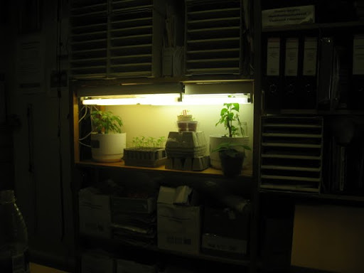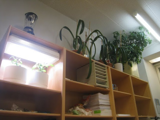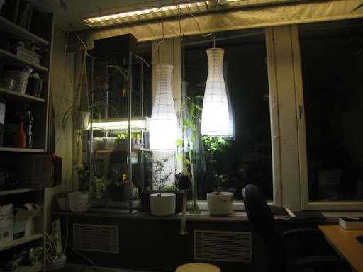Tossa muutama kuva nykyisistä olosuhteista. Eli ihan konttoritiloissa nämä chiliviljelmät on. Tilaa täälä vois olla usealle kymmenelle kasville, tai ehkäpä jopa sadalle. Ikkunanlautaa on joka ilmansuuntaan yhteensä kymmeniä metrejä. Toistaiseksi olen järjestänyt jokaiselle kasville ja taimelle eslin tai loisteputken mut täytyy kokeilla noilla taimilla, jahka ne vielä vähän kasvaa, riittäkö ikkunanlaudan luonnonvalo ja yleisvalot henkissä pysymiseen kevääseen asti.