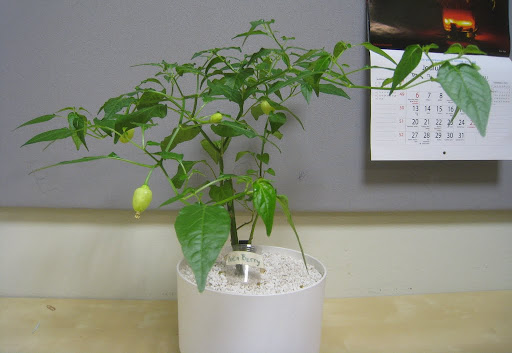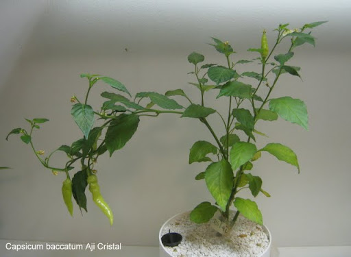 ToniPetteriltä saatu C. baccatum Aji Cristal tekee satoa. Jännitystä ilmassa kestääkö oksa katkeamatta. Kuvan oton jälkeen leikkasin nuput, kukat, mahdolliset podin alut ja pienimmän oksassa roikkuvista neljästä podista veks. Ja söin sen. Maistu vihannekselta. :P