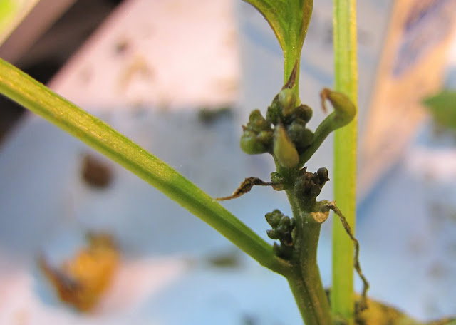 En minäkään ensin uskonut kylmän tekevän tuollaista jälkeä. Vaurioita on ilmennyt pitkän ajan kuluessa eikä niinkään yhdellä pläjäyksellä. Nähtävästi myös kylmyys on ollut pitempiaikaista yöaikaan. Kasvit melkein tottuvat siihen kunnes niille riittää. Esim.Pequin Cielo rojon vein Keravalle kukkivana ja parin viikon kuluttua ilmeni kasvupisteiden kuivumista. Eipä tarttunut viereisiin chileihin minkä taudin ollessa kyseessä pitäisi tapahtua.