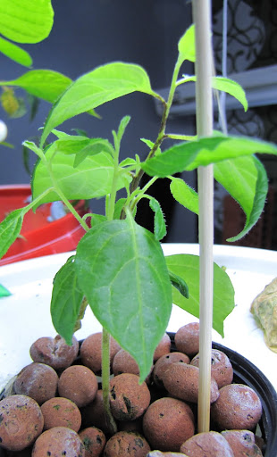 Siitä näkee hieman osviittaa, millaisia ovat lähes kaikki hydrokasvit. Todellakin on lupa nyt odottaa kunnon satoa, sillä aivan täynnä kukannuppuja. Kuvassa yksi oksanpätkä Tobago Sweetistä.