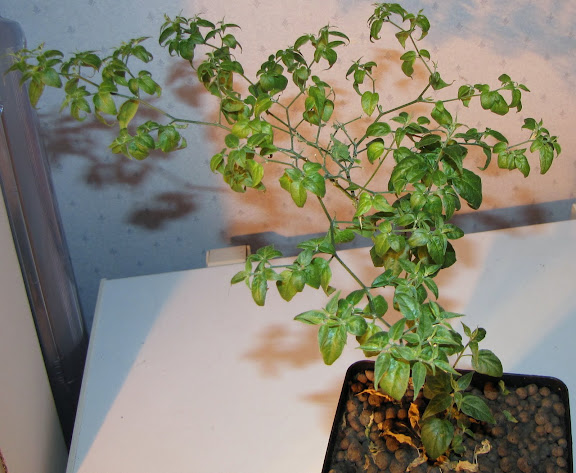 Mulla C.annuum Onza kuivahti ämpäribubblerissa pahasti. Pudotti melkein kaikki lehtensä muttei kukkia eikä podinalkujaan. Samassa ämpärissä ollut Chilhuacle negro tiputti kaikki lehtensä ja kukkansa l. oli pelkkä ranka. Nyt siinä näkyy jo uusia silmuja. Kyllä tuo Goro tuosta elpyy. Ehkä olis kannattanut aluksi laittaa pikkaisen laimeampaa litkua.