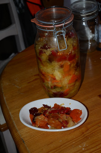 Laitan yhden kuvan tölkkiin hapatusruukusta siirretystä maitohappokäymisellä valmistetusta hapanchilistä. Voin vakuuttaa että potkii hyvin, hapatus ei juurikaan vähennä habojen tulisuutta. Jos soseuttaa niin kaalin voi perata pois tai sitten jättää, kokeilen kohta kunhan polte hiukan hellittää.