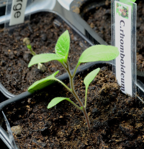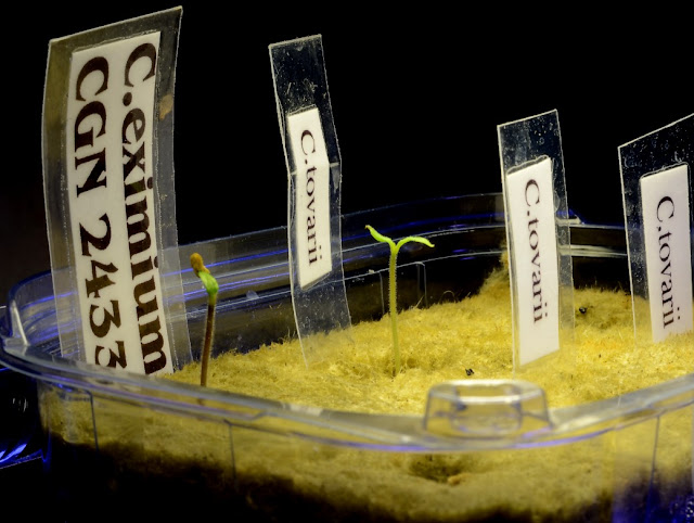 Vieressä itää kypäräpää CGN24332 jopa kahden siemenen voimin. Toinen melkein erottuu muovin läpi villakuopassaan. Onkos tämä nyt C.eximium vai peräti C.buforum? Kuka osais kertoa? Ulkomaanharrastajien päiväkirjoissa monella ko. lajike on merkattu C.buforumiksi.