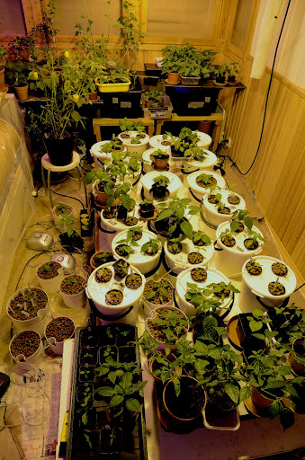 Tällä haavaa taimia+talvehtijoita on 240kpl ja viimevuoden yli kolmeensataan en aio yrittää. Onneksi on ottajia tiedossa länsirannikon tuntumassa ja vähän muuallakin. Ryökäleet vaan kasvavat uhkaavasti ja tila alkaa taas loppua. Kuola valuen katselen kuvia Tammisillan tilavista kasvatuspöydistä mutta sitten järki voittaa; he ovat ammatilaisia ja tilat heillä on oltava tarpeenmukaiset.