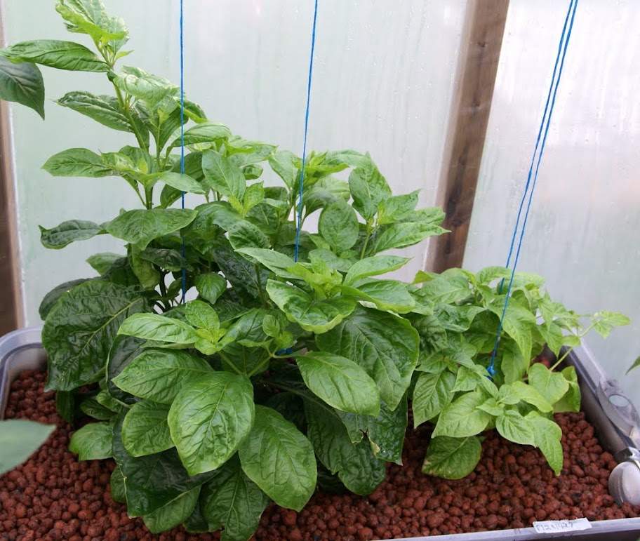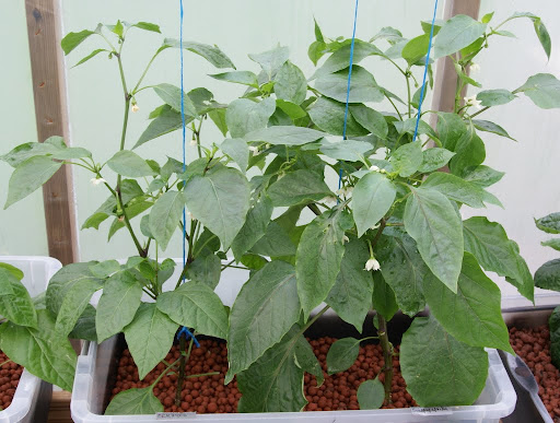 DRH 7400 ja Suippopaprika. Molemmat on hyvässä vauhdissa ja suipossa on monta kasvavaa podiakin. Mullassa kasvava DRH:n kaksoiskappale on säälittävä kymmensenttinen risu. Multa-suippo sentään kukkii ja tekee muutamaa podia, mutta koko on kolmasosa vesiversiosta.