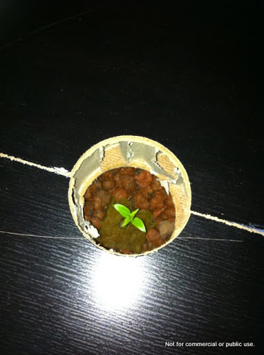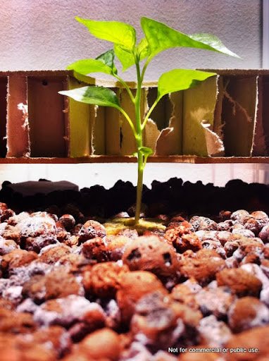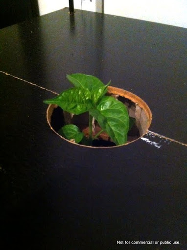 Molemmille kasveille on oma reikänsä, ja tällä hetkellä pienet taimet saavat vain rajoitetun valotehon, sillä eivät vielä yllä reijän yläreunan yläpuolelle: